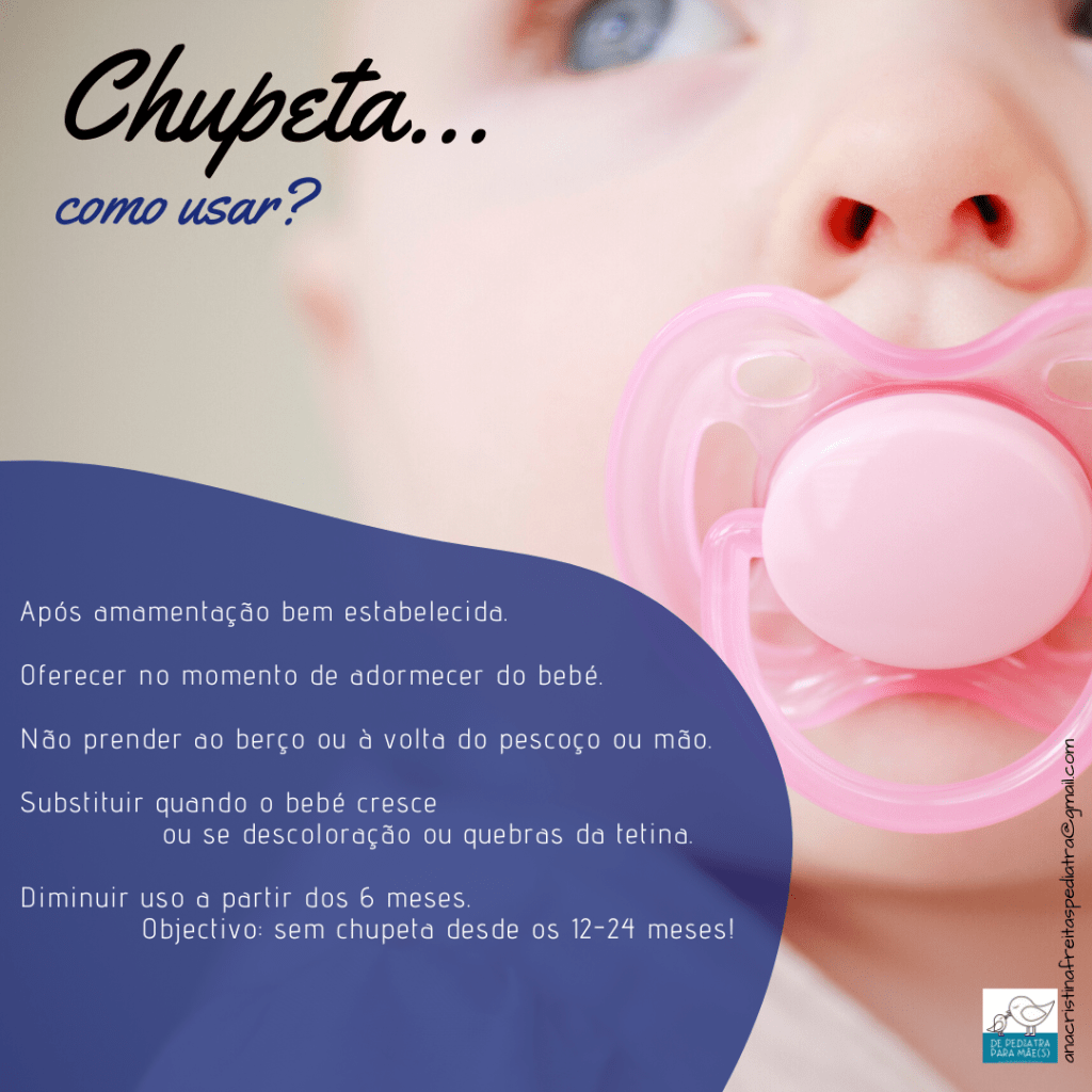 Usar a chupeta nos momentos de adormecer é importante para prevenir a síndrome de morte súbita do lactente. Mas não se deve forçar a sua utilização se o bebé não a quiser (nem adoçar a ponta da chupeta!). Se a chupeta cair durante o sono, não devemos voltar a colocá-la na boca do bebé. E deixe a chupeta livre e solta! Está proibido prender a chupeta ao berço ou à volta do pescoço ou mão do bebé!
