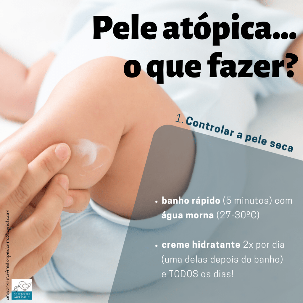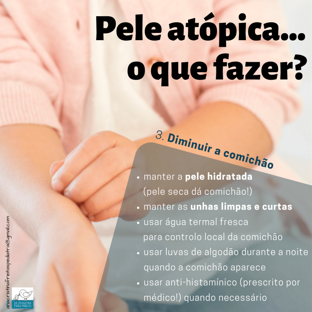 Inicialmente hidratem mais vezes a pele, reforcem as medidas de controlo da comichão e contactem a pediatra. Se não melhorar, é provável que vos recomende um creme com corticóide para usar durante alguns dias. Existem corticóides de várias intensidades e a pele do bebé é muito sensível… não usem sem falar com um médico!