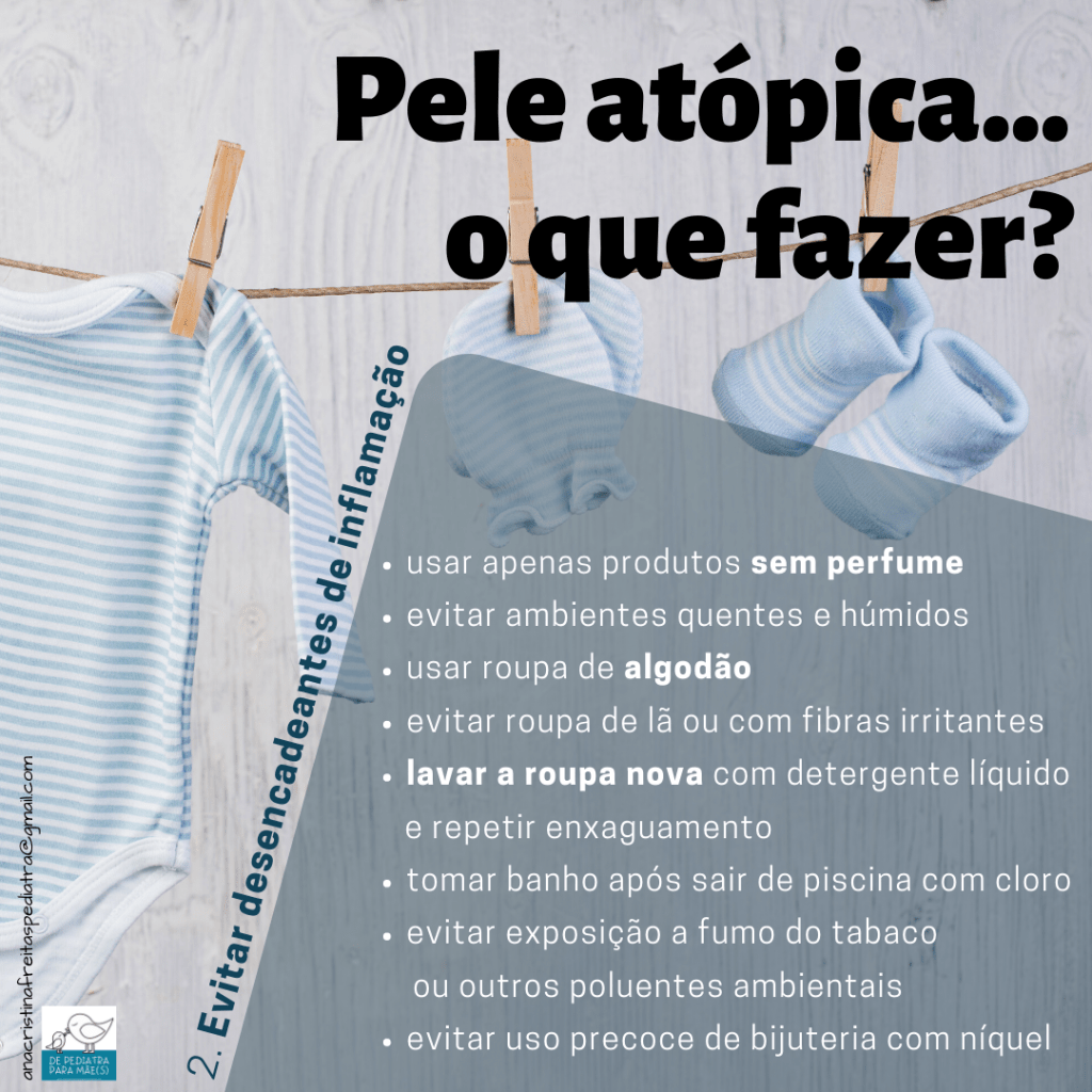 E por fim não esquecer que estas crianças têm uma pele mais sensível e suscetível a infeções, por terem mais “brechas” por entram as bactérias. Portanto, se as zonas de eczema começarem a ficar ainda mais vermelhas e com uma crosta amarelada é importante consultar o médico para saber se é necessário começar antibiótico.