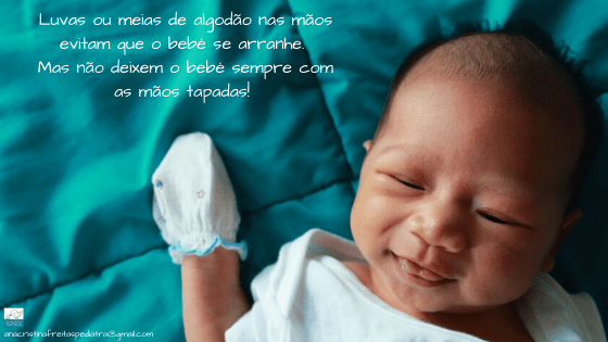 Até conseguirem limar as unhas, coloquem umas luvas ou meias de algodão nas mãos para evitar que o bebé se arranhe. Mas não deixem o bebé sempre com as mãos tapadas… os bebés precisam de sentir com as mãos, de tocar na própria cara, de sentir a pele da mãe durante a amamentação.