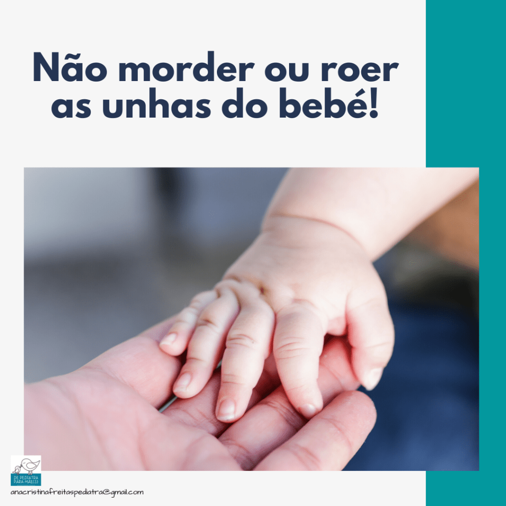 Nunca morder ou roer as unhas do bebé! Mesmo que uma avó ou vizinha diga que antigamente era assim… Os microorganismos da boca dos adultos podem causar infeções nos dedos dos bebés! Portanto… nem pensar!