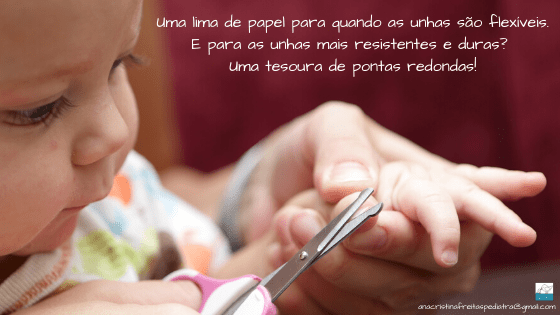 As unhas dos bebés crescem muito rápido, principalmente as das mãos! Quando as unhas começarem a ser mais resistentes e duras, cortá-las com uma tesoura de pontas redondas é a forma mais fácil de as manter curtas. Também podem usar um corta-unhas própria para bebés, se preferirem.